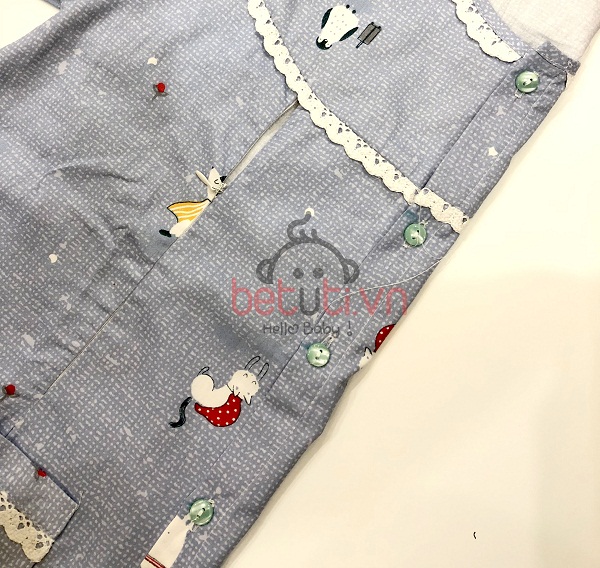 Điểm đặc biệt của bộ đồ nằm ở phần áo. Áo được thiết kế dài và kín để tránh gió, giữ ấm cơ thể cho mẹ. Áo có hàng cúc đóng mở ở giữa thân kiểu pijama, vẫn rất thuận tiện khi mặc.