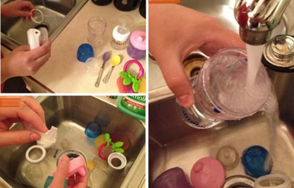 Bước 3:Sau khi tráng và vớt dụng cụ, có thể rửa tráng lại 2 lần với nước ở nhiệt độ bình thường. Vẫn dùng tay kì cọ nhẹ và vẩy nước sau khi vớt dụng cụ và để ráo. Cẩn thận hơn, mẹ bỉm sữa nên kiểm tra xem dụng cụ còn mùi sữa hay mùi nước rửa chén hay không.
