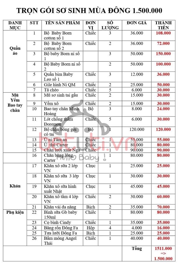 Bảng báo giá trọn gói đồ sơ sinh cho bé mùa đông gói cơ bản