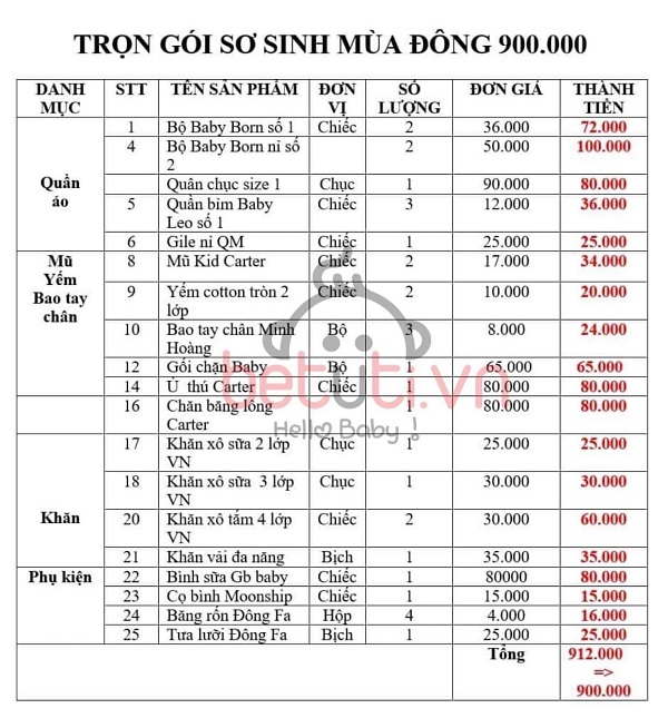 Combo đồ sơ sinh cho bé gái mùa đông gói tiết kiệm bao gồm những sản phẩm sau: