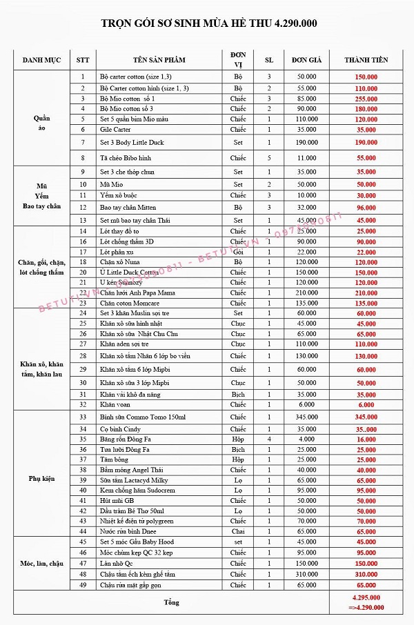 Combo cao cấp cho bé năm 2020 có tới 49 sản phẩm với số lượng và giá cả như sau: