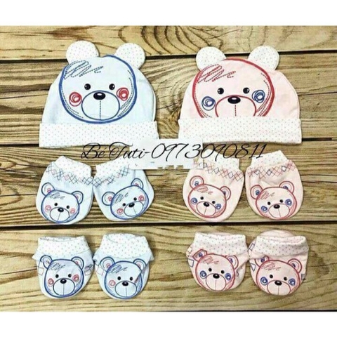 Set mũ boa tay chân Thái chỉ có 3 màu là xanh nước biển, hồng đậm và vàng tươi, trang trí mặt gấu khá ấn tượng. Con gái có thể xài được cả 3 màu. Nhưng con trai thì kén hơn 1 chút. Màu xanh và màu vàng thôi.