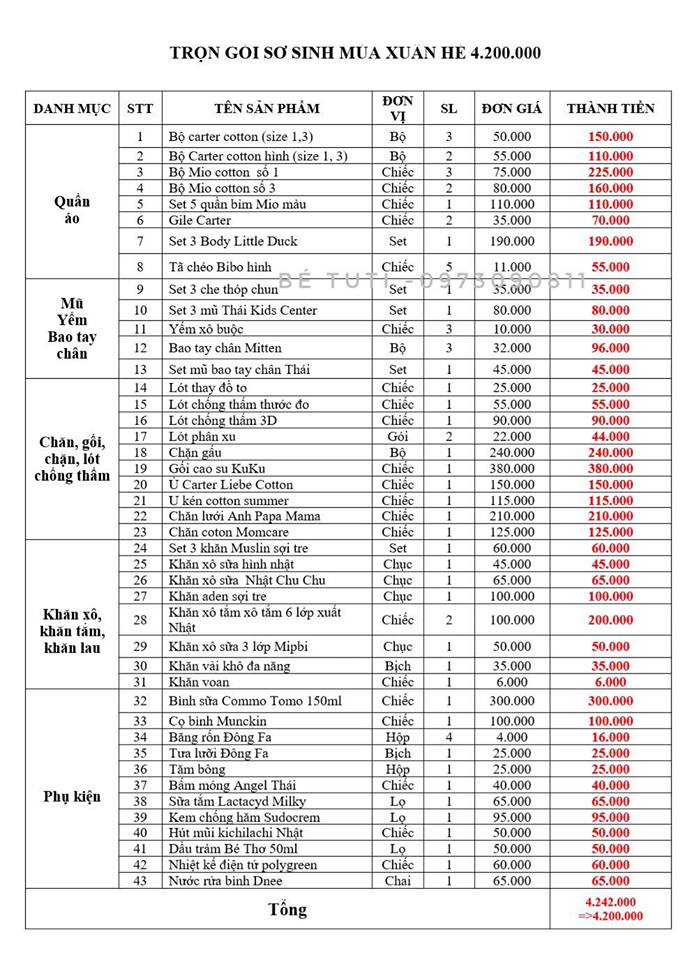 Bảng danh sách và giá trị sản phẩm tron combo đồ sơ sinh xuân hè cho bé