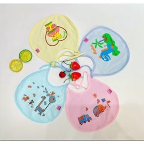Yếm ăn dăm sơ sinh nhìn hơi giống quả táo cắn dở. Họa tiết trên bề mặt thường là hình con vật, bông hoa, xe cộ,… Mỗi đợt hàng về họa tiết có thể khác nhau. Nhưng ba mẹ yên tâm là vẫn đẹp, vẫn cute như hình nhé.